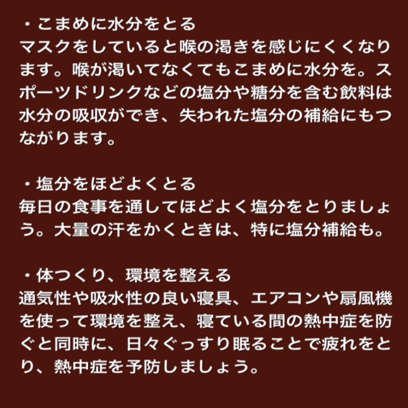 マスクをしていると喉の渇きを感じにくくなります。喉が渇いてなくてもこまめに水分を。スポーツドリンクなどの塩分や糖分を含む飲料は水分の吸収ができ、失われた塩分の補給にもつながります。