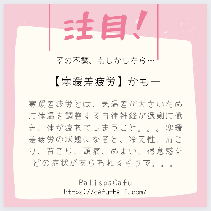 *寒暖差疲労とは、気温差が大きいために体温を調整する自律神経が過剰に働き、体が疲れてしまうこと。。。寒暖差疲労の状態になると、冷え性、肩こり、首こり、頭痛、めまい、倦怠感などの症状があらわれるそうで。。。